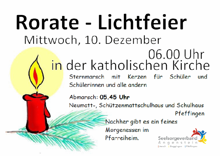 Am Mittwoch, 10. Dezember findet in der katholischen Kirche Aesch der Rorategottesdienst für Kinder statt. Mit Laternen laufen Kinder, Eltern und alle die Freude daran haben, um 5.45 Uhr von den Schulhäusern in Aesch und Pfeffingen los, zu einer Feier der speziellen Art. Wir feiern um 6.00 Uhr am Morgen miteinander im Kerzenlicht in der Kirche Aesch. Anschliessend sind alle eingeladen zum Morgenessen im Pfarreiheim Aesch. Schön, wenn Sie auch dabei sind.